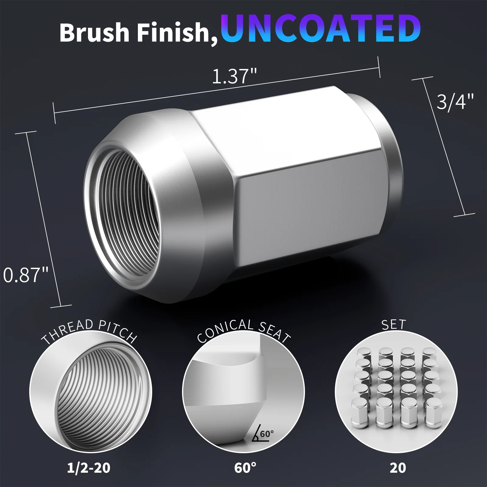 1/2-20 inch standard thread, 3/4″ (19mm) hex, length 1.37″(35mm), width 0.87″ (22mm), this specification design ensures the compatibility of vehicle hub, compatible with universal tools, easy installation. 60 Degree cone/conical seat Enhances the fit degree with the wheel hub contact surface to improve the stability of the vehicle at high speed. enclosed integrated forming design dustproof and waterproof, avoid thread rust, prolong service life.